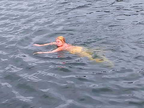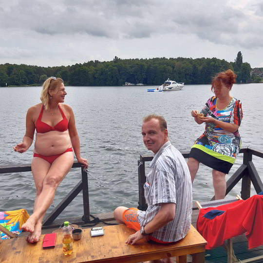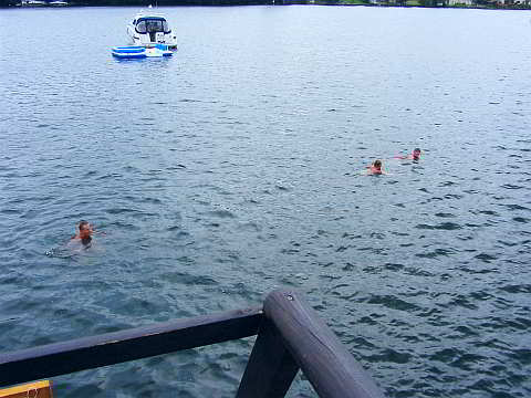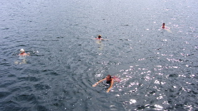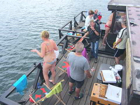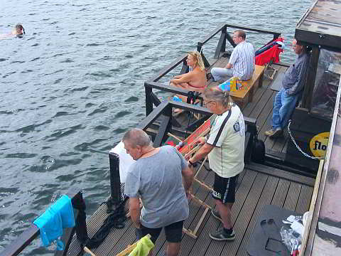 Das Wetter war letztendlich noch so schön, dass fünf Teilnehmer ihre mitgebrachten Badesachen nutzen und ein paar Runden um die Flöße im lauwarmen Wasser schwammen.