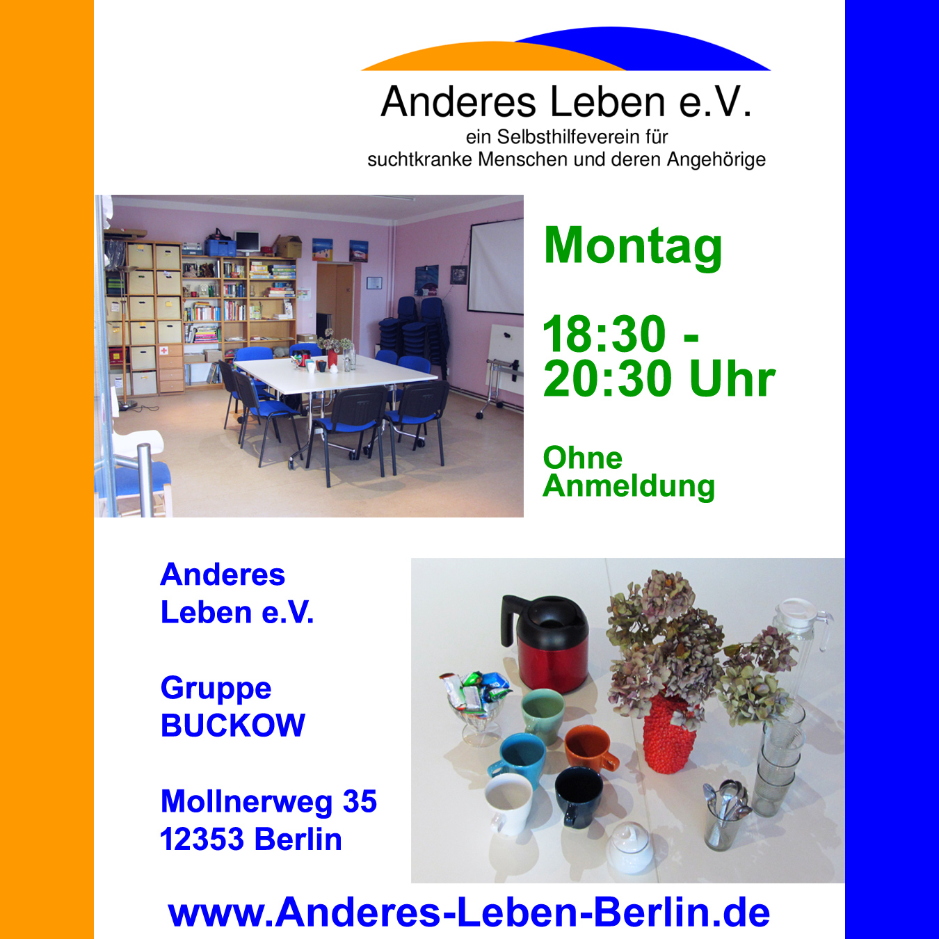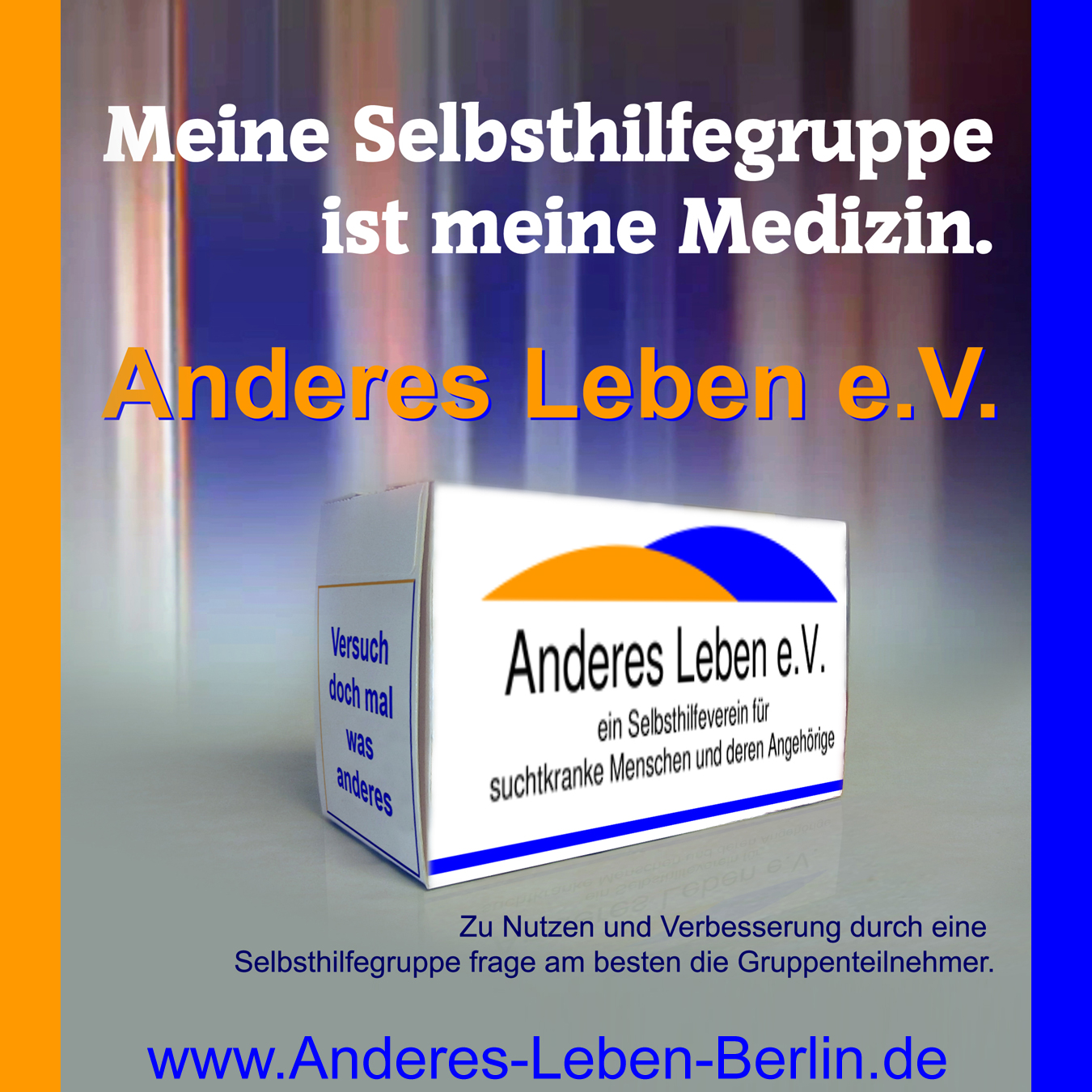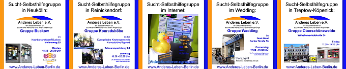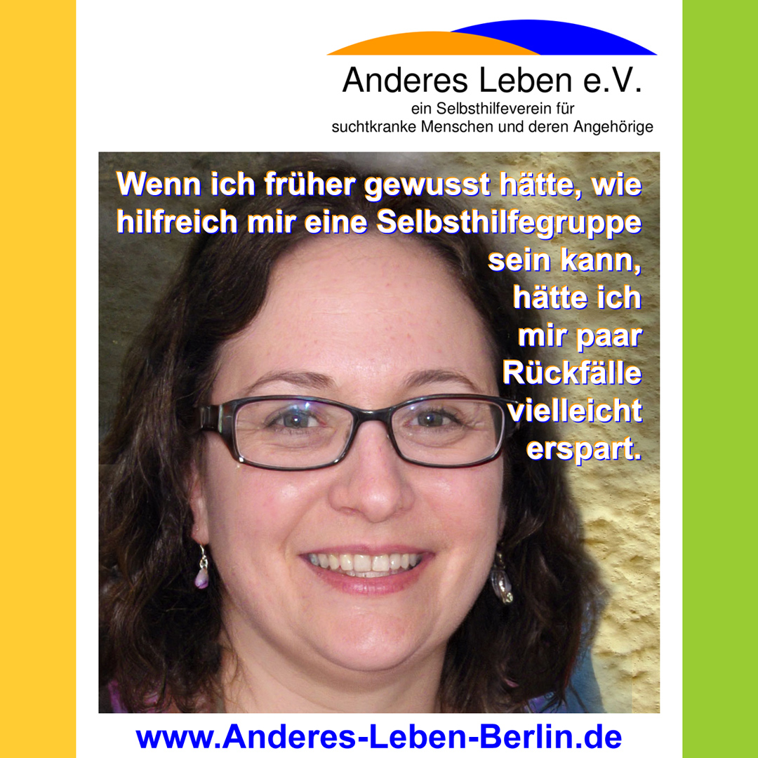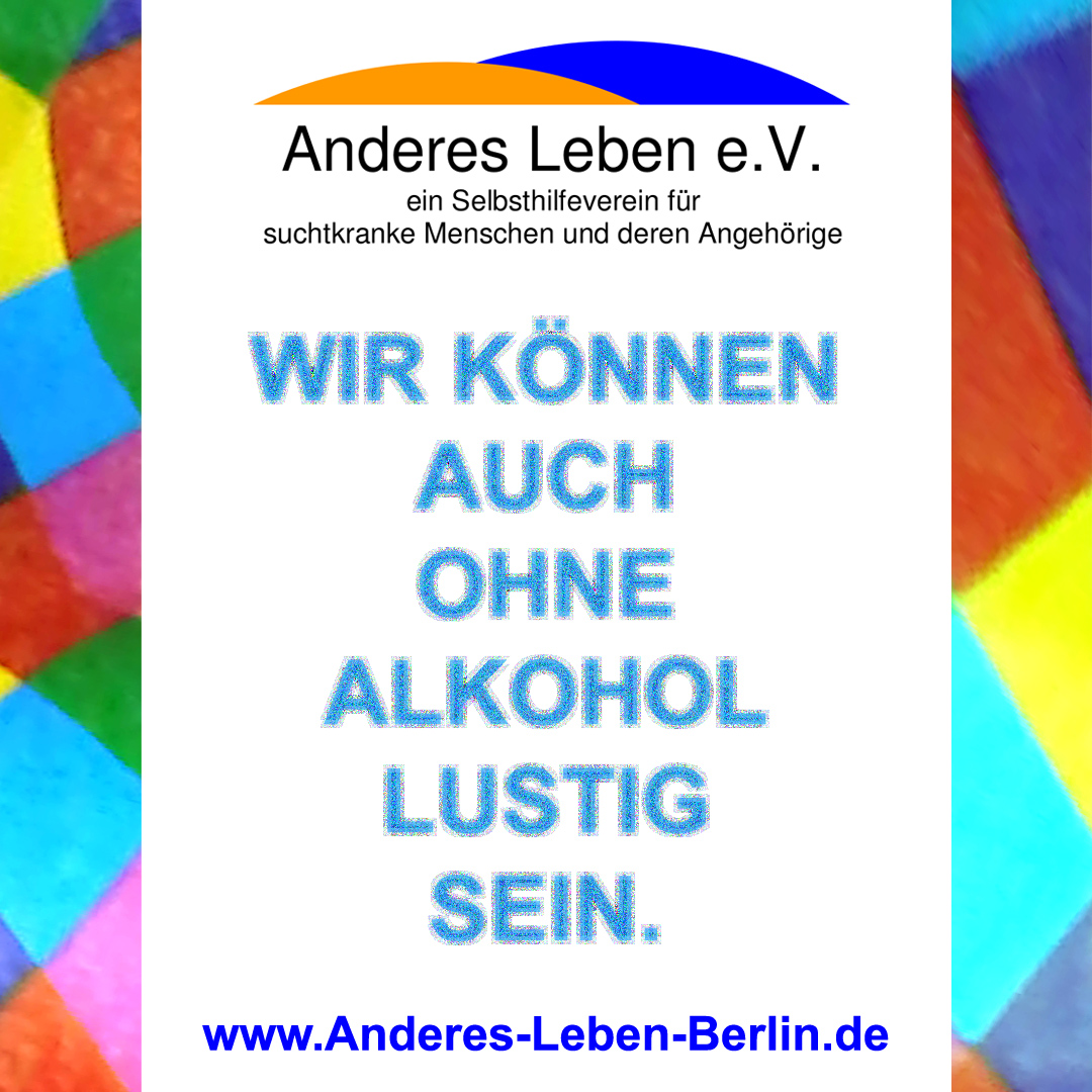 *nehmen wir mit einem Diskussionsabend in der Videokonferenzgruppe teil. Thema: Ist ein Drink bei Dir auch schon zu viel? ![]() Wir freuen uns auf Deine Teilnahme!Den Verweis zur Gruppe und weitere allgemeine Informationen findest Du hier: VIDEOKONFERENZGRUPPE.Liebe Teilnehmerinnen und Teilnehmer unseres geplanten Diskussionsabends, aufgrund organisatorischer Gründe muss der Termin am 11. Juni leider kurzfristig verschoben werden. Wir freuen uns, euch daher am 18. Juni zur Diskussion wiederzusehen. Für Anmeldungen oder Fragen steht euch Oliver gerne zur Verfügung: webmaster@Anderes-Leben-Berlin.de. Vielen Dank für euer Verständnis. ![]() Meine Selbsthilfegruppe ist meine Medizin. Anderes Leben e.V. bietet Selbsthilfegruppen für Menschen mit Suchtproblemen an. So erzähle ICH von meinen Erfahrungen und ICH höre zu, was die anderen von sich zu berichten haben. Durch den Austausch von Problemen aber auch freudigen Erlebnissen können wir alle voneinander profitieren und haben dadurch die wertvolle Chance aus diesen positiven und negativen Erfahrungen zu lernen. Die Gruppe ist ein sicherer Raum, der uns ermöglicht so ziemlich jedes Thema anzusprechen, was uns bedrückt oder um auch unsere eigene Wut und Ärger loszulassen. Als ehemalige Betroffene bieten wir Hilfe und Unterstützung für Menschen,die ihr Leben verändern wollen und an einem anderen, suchtfreien Leben interessiert sind. Unser Verein steht auch den Angehörigen suchtkranker Menschen beratend zur Seite und empfiehlt ihnen, an den Gruppensitzungen teilzunehmen. Gemeinsam können wir Wege finden, um einander zu helfen um ein neues, ANDERES LEBEN zu leben. Zu Nutzen und Verbesserungen durch eine Selbsthilfegruppe frage am besten die Gruppenteilnehmer. Und worauf wartest Du?