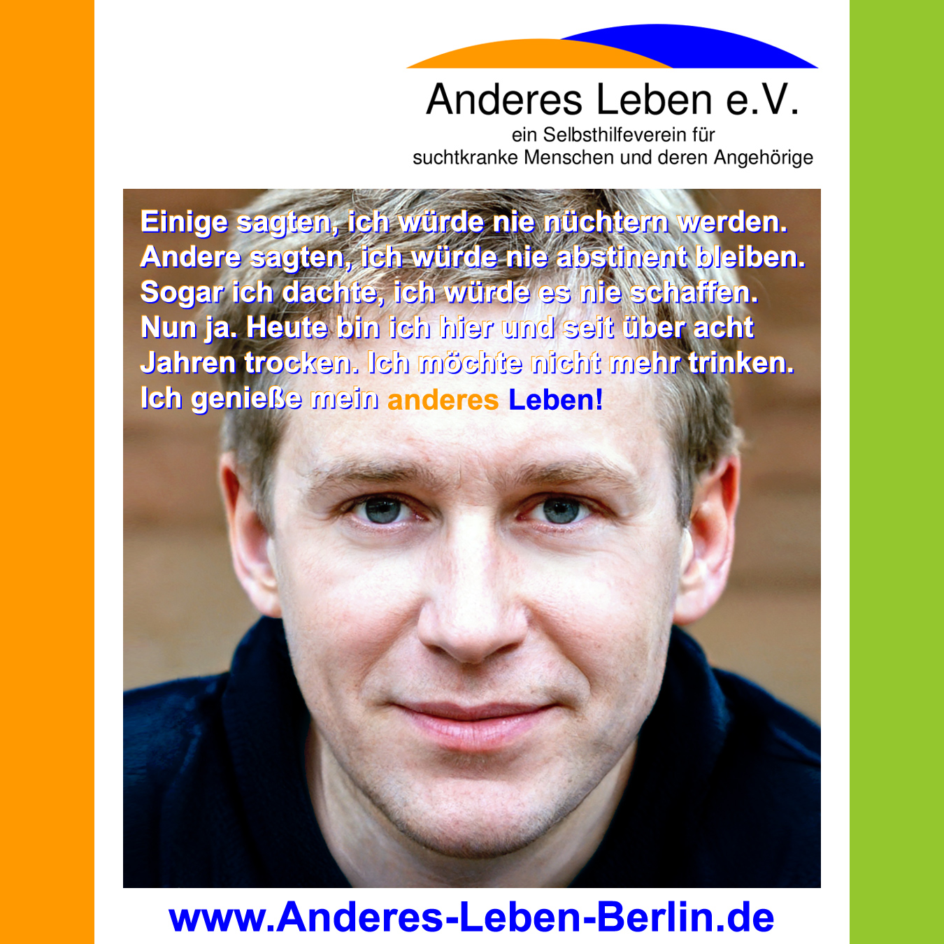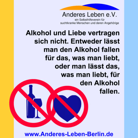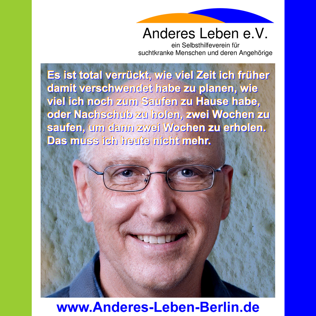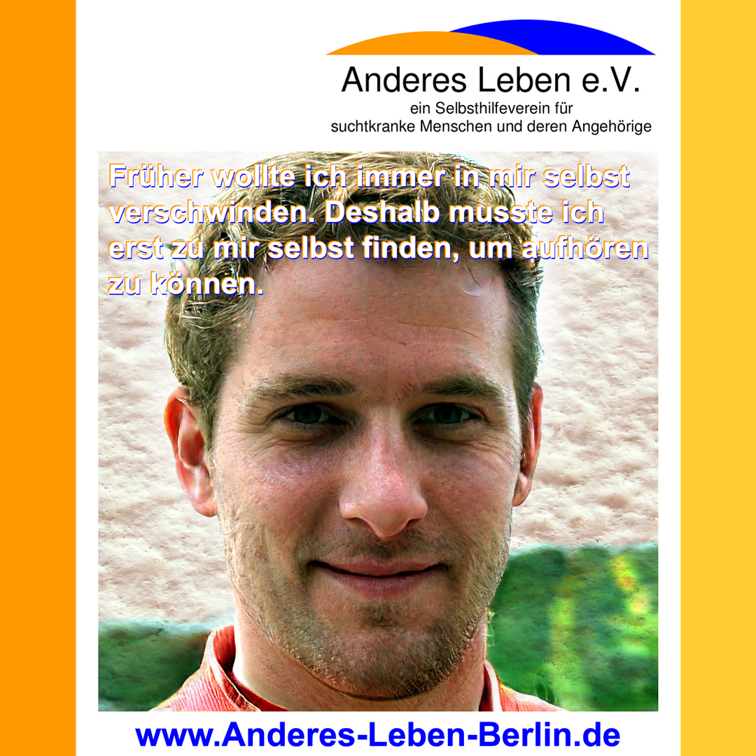 Einige sagten, ich würde nie nüchtern werden. Andere sagten, ich würde nie abstinent bleiben. Sogar ich dachte, ich würde es nie schaffen. Nun ja. Heute bin ich hier und seit über acht Jahren trocken. Ich möchte nicht mehr trinken. Ich genieße mein anderes Leben! Trocken werden musste ich alleine. Aber Dank meiner Selbsthilfegruppe habe ich die Unterstützung gefunden auch trocken zu bleiben. Denn niemand kann Sucht begreifen, wenn man nicht selbst betroffen ist. Und in einer Selbsthilfegruppe sitzen nun mal lauter 'Experten'. Keine Lügen mehr! Keine 'Beschaffung und Lagerhaltung' mehr! Kein schlechtes Gewissen! Ich schaue wieder nach vorn. Brauchst Du auch Hilfe und Unterstützung, um vom Alkohol oder anderen Drogen loszukommen? Anderes Leben e.V. ist ein Selbsthilfeverein für suchtkranke Menschen und deren Angehörige. Wir haben Selbsthilfegruppen von Montag bis Freitag in Buckow, Konradshöhe, online, Wedding und Oberschöneweide. Unsere Gruppen sind offen für alle Betroffene, Angehörige und Interessierte. Informationen zu unseren Gruppen und dem Verein findest Du hier auf dieser Webseite.