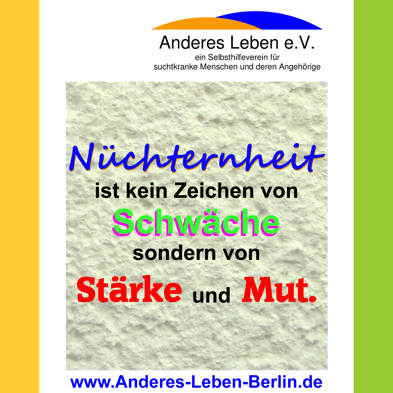 SUCHT macht keine Sommerpauseund unsere Selbsthilfegruppen für suchtkranke Menschen auch nicht!![]() ![]() ![]() Wir sind auch in den sonnigen Monaten für euch da und bieten Unterstützung und Hilfe an. Denn wir wissen, wie schwer es sein kann, den Weg aus der Sucht zu finden und zu gehen. Aber wir sind hier, um uns einander zu unterstützen und zu ermutigen. Jeder kleine Schritt in Richtung eines abstinenten Lebensstils ist ein großer Erfolg und wir sind stolz auf jeden Einzelnen von uns. Es ist wichtig, sich in schwierigen Situationen nicht alleine zu fühlen. Deshalb möchten wir euch ermutigen, uns zu kontaktieren und unsere Selbsthilfegruppen kennenzulernen. Zusammen können wir den Weg aus der Sucht finden und uns einander unterstützen. Wenn ihr Hilfe braucht oder einfach nur reden möchtet, seid ihr bei uns herzlich willkommen! Unsere Gruppen sind offen für alle Betroffenen, Angehörige und Interessierte. Wir haben Selbsthilfegruppen von Montag bis Freitag in Buckow, Britz, Konradshöhe, online, Wedding und Oberschöneweide. In diesem Sinne wünschen wir allen einen schönen Sommer und freuen uns, euch bei einer unserer nächsten Selbsthilfegruppen begrüßen zu können. Euer Selbsthilfeverein für suchtkranke Menschen - Anderes Leben e.V. ![]()
