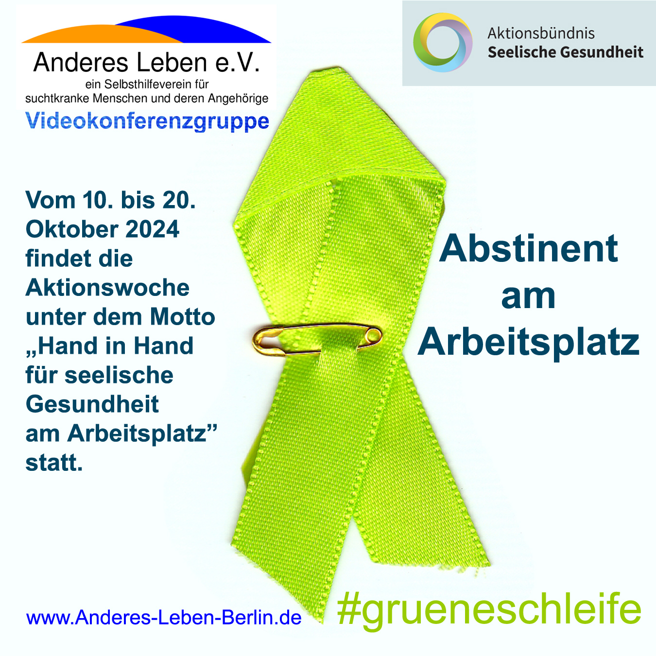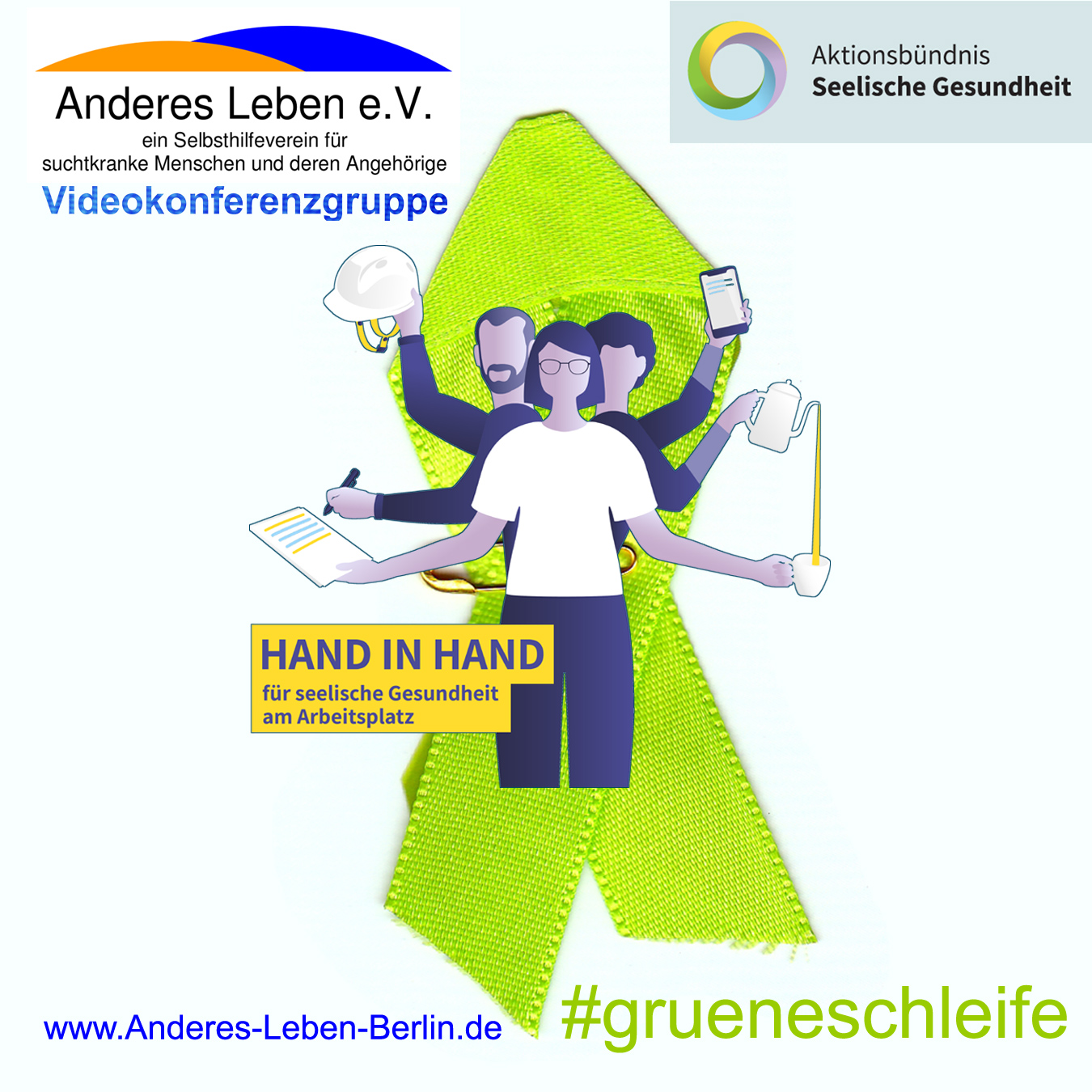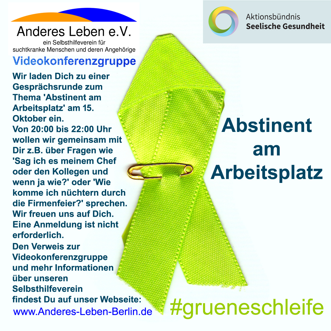 ![]() 19.12.1956 - 21.10.2024 Klaus war in zahlreichen Vereinen ehrenamtlich aktiv und hat uns durch seinen schwierigen Werdegang und seine Freundlichkeit beeindruckt. Für die öffentlichen Auftritte in Funk und TV und das Engagement im Verein 'Anderes Leben' haben ihn viele von uns als bescheidenen und freundlichen Menschen kennenlernen dürfen. Er wird uns in wertvoller Erinnerung bleiben. In stiller Trauer Anderes Leben e.V. ![]() Zu FACEBOOK / Anderes Leben Gruppe - private Gruppe: An alle Teilnehmer der privaten Gruppe bei FACEBOOK, wir schließen diese Gruppe in den nächsten Tagen. (18.10.) Wir wollen bei Facebook etwas anderes ausprobieren und freuen uns, wenn ihr uns weiterhin bei FACEBOOK oder INSTAGRAM folgt. 10. Oktober 2024 - Tag der seelischen Gesundheit 2024 ![]() Die Woche der Seelischen Gesundheit findet vom 10. bis 20. Oktober 2024 unter dem Motto "Hand in Hand für seelische Gesundheit am Arbeitsplatz" statt. Die Videokonferenzgruppe von 'Anderes Leben e.V.' beteiligt sich an der Aktionswoche mit einer Gesprächsrunde am ![]() DIENSTAG | 15.10.2022 | 20:00 - 22:00 Uhr Unser Thema: 'Abstinent am Arbeitsplatz':