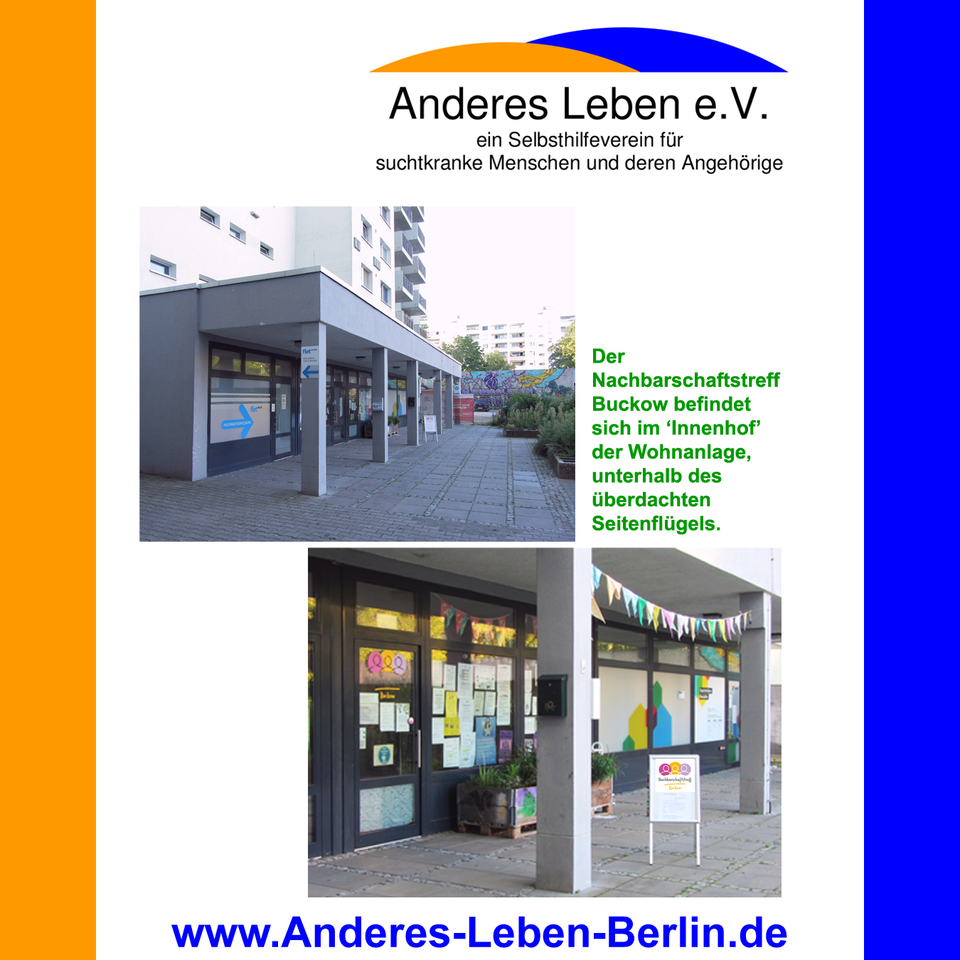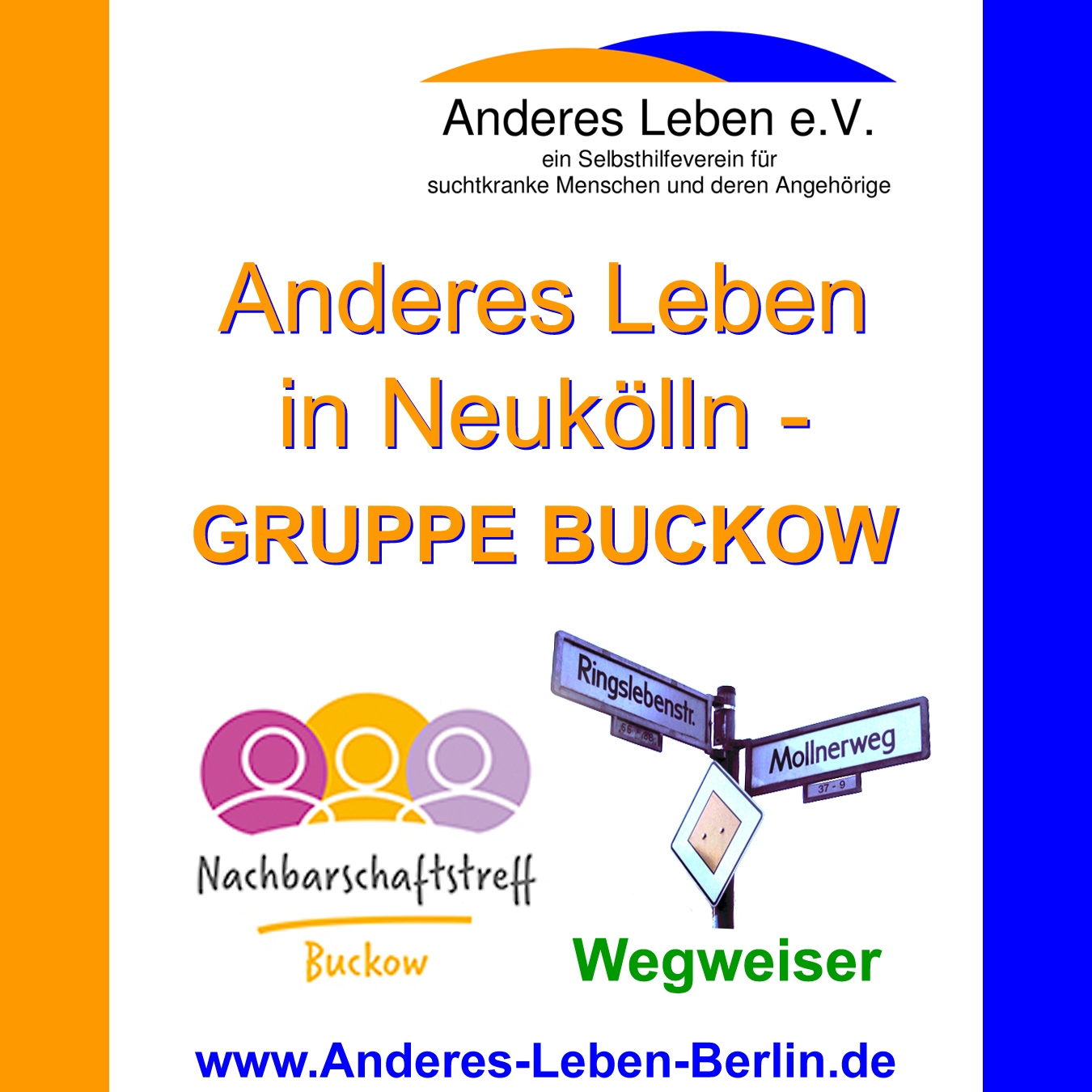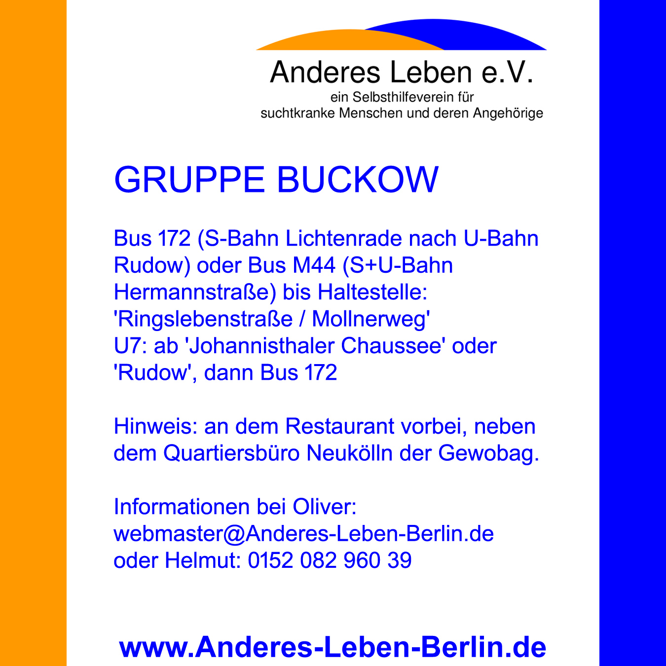 SELBSTHILFEGRUPPEN: Die GRUPPE BRITZ-SÜD schließt Ende Oktober 2023 Nun ist es offiziell: Unsere GRUPPE BRITZ-SÜD muss leider Ende Oktober 2023 bis voraussichtlich März 2025 wegen Renovierungsarbeiten in der Hephatha-Gemeinde schließen. Wie es danach mit der Gruppe weitergeht, ist zum jetzigem Zeitpunkt überhaupt noch nicht abzuschätzen. Deshalb möchten wir hier nochmal auf unsere andere Selbsthilfegruppe in Neukölln hinweisen. Die GRUPPE BUCKOW im Nachbarschaftstreff Buckow findet ebenfalls montagabends (von 18:30 bis 20:30 Uhr) statt. Alle weitere Informationen zur Adresse, Anfahrt mit der BVG, Ansprechpartner, dem Nachbarschaftstreff Buckow usw. findest Du unter SELBSTHILFEGRUPPEN. Wir bedanken uns zunächst recht herzlich für die langjährige und gute Zusammenarbeit mit der Evangelischen Hephatha-Kirchengemeinde in Berlin-Britz. Anderes Leben e.V.