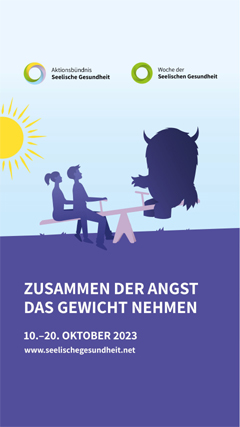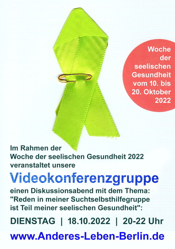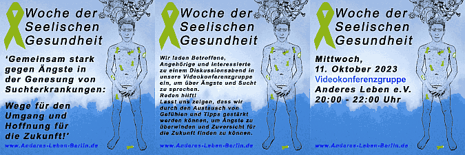 Woche derSeelischen Gesundheit: Die Aktionswoche findet vom 10. bis 20. Oktober 2023 unter dem Motto "Zusammen der Angst das Gewicht nehmen" statt. Die Videokonferenzgruppe beteiligt sich an der Aktionswoche mit einem Diskussionsabend am Mittwoch, den 11. Oktober von 20:00 bis 22:00 Uhr. Unser Thema: "Gemeinsam stark gegen Ängste in der Genesung von Suchterkrankungen: Wege für den Umgang und Hoffnung für die Zukunft!"