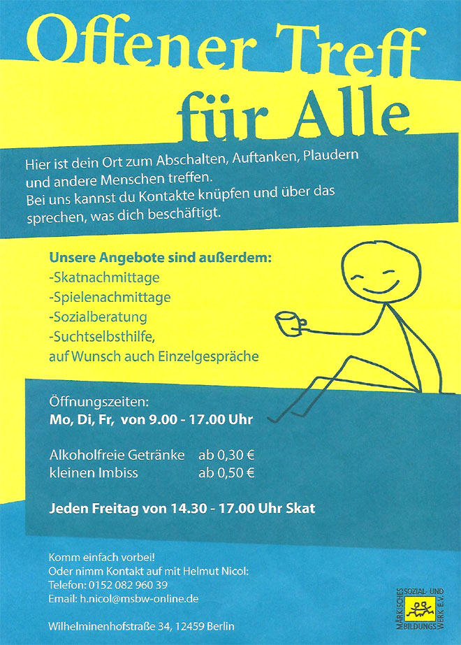 Sucht macht keine Sommerpause!Im Sommer steigt die Suchtgefahr, da Alkohol und Drogen oft mit Freizeitaktivitäten in Verbindung gebracht werden. Grillpartys, Festivals und Strandbesuche sind nur einige Beispiele für Situationen, in denen der Konsum von Suchtmitteln verlockend sein kann. Somit ist die Versuchung groß und auch das Risiko für Rückfälle umso höher. Sucht kennt in der Sonne, im Schatten, im Wasser, am Meer, in den Ferien oder im Urlaub keine Pause! ... und wir auch nicht! Egal, ob es regnet, stürmt und schneit, oder ob die Sonne scheint: unsere Selbsthilfegruppen sind das ganze Jahr über geöffnet. Es ist wichtig, sich bewusst mit dem eigenen Konsumverhalten auseinanderzusetzen und gegebenenfalls Hilfe anzunehmen. Wir sind da, wenn Du Hilfe benötigst. Besuche uns in Buckow, Britz, Konradshöhe, Wedding, Oberschöneweide oder online.