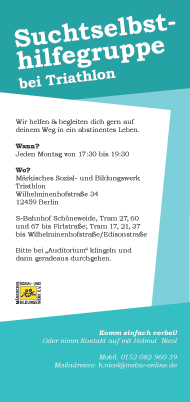 Mitgliederversammlung:Samstag - 06. Januar 2024 - 11:00 Uhr Bitte beachten: eine rechtzeitige Bestätigung oder Absage eurer Teilnahme bis Silvester ist für uns wichtig. Danke! Ort: Märkisches Sozial- und Bildungswerk e.V., 'Suchthilfeprojekt Triathlon', Wilhelminenhofstraße 34, 12459 Berlin Bitte beachtet die Änderungen bei den Selbsthilfegruppen zu den Feiertagen: