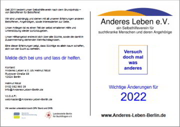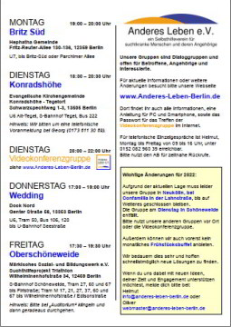 Neuer Gruppenflyer 2024:Seit Anfang April ist unser aktueller Fyler mit den Zeiten und Adressen unserer Selbsthilfegruppen im Umlauf. ![]() Anderes Leben e.V. - Gruppenflyer 2024 (pdf) zum Herunterladen und Ausdrucken.