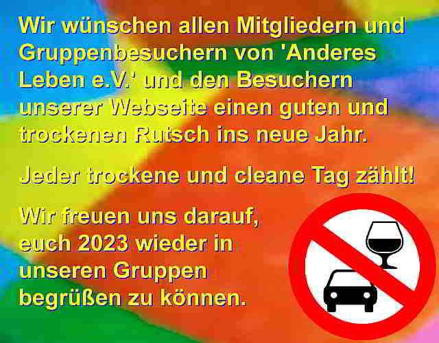 Die guten Vorsätze für das neue Jahr! "Keinen Alkohol mehr trinken!" oder "Ab jetzt Drogenfrei!"? Hast Du es bis heute bereits geschafft? Oder hat es doch (noch) nicht geklappt? So oder so? Brauchst Du vielleicht noch jemanden zum Reden und Zuhören? Menschen, die ebenfalls Betroffene sind? Die wissen und kennen, wovon Du sprichst und wie es Dir geht? Brauchst Du noch Unterstützung? Anderes Leben e.V. bietet Selbsthilfegruppen für Menschen mit Suchtproblemen an. Als ehemalige Abhängige haben wir die Chance unsere Erfahrungen an andere Menschen weiterzugeben und jedem in einer ähnlichen Situation zu helfen. Indem wir uns von unseren Sorgen, Problemen und Ängsten erzählen, haben wir gemeinsam die Möglichkeit nach Lösungen zu suchen und andere Wege, trocken und clean, aufzuzeigen. Darüber hinaus gibt der Verein Möglichkeiten zur Hilfe und Unterstützung für Menschen, die ihr Leben verändern wollen und an einem anderen, suchtfreien Leben interessiert sind. ![]() Melde dich bei uns und lass dir helfen. Wir bieten 6 Gruppen an 4 Tagen in der Woche an. Alle Informationen zu unseren Gruppen findest Du unter: SELBSTHILFEGRUPPEN. (01.01.2023)